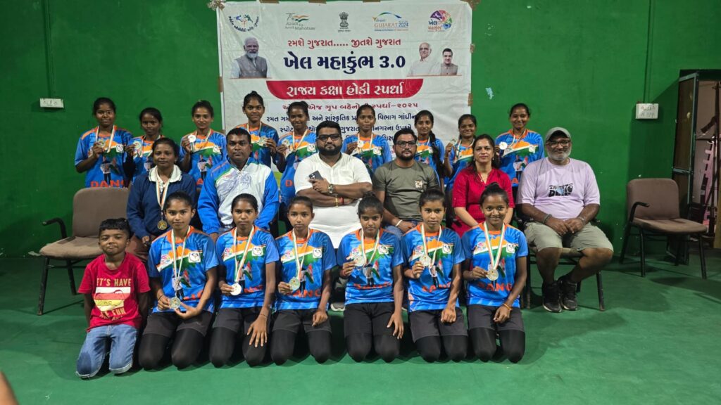 ખેલ મહાકુંભ ૩.૦ અંતર્ગત રાજ્ય કક્ષાની હોકી સ્પર્ધામાં બહેનોના ઓપન એજ ગૃપમાં ડાંગ જિલ્લાની બહેનોએ સિલ્વર મેડલ મેળવી રાજ્ય કક્ષાએ દ્વિતીય ક્રમ પ્રાપ્ત કર્યો છે.